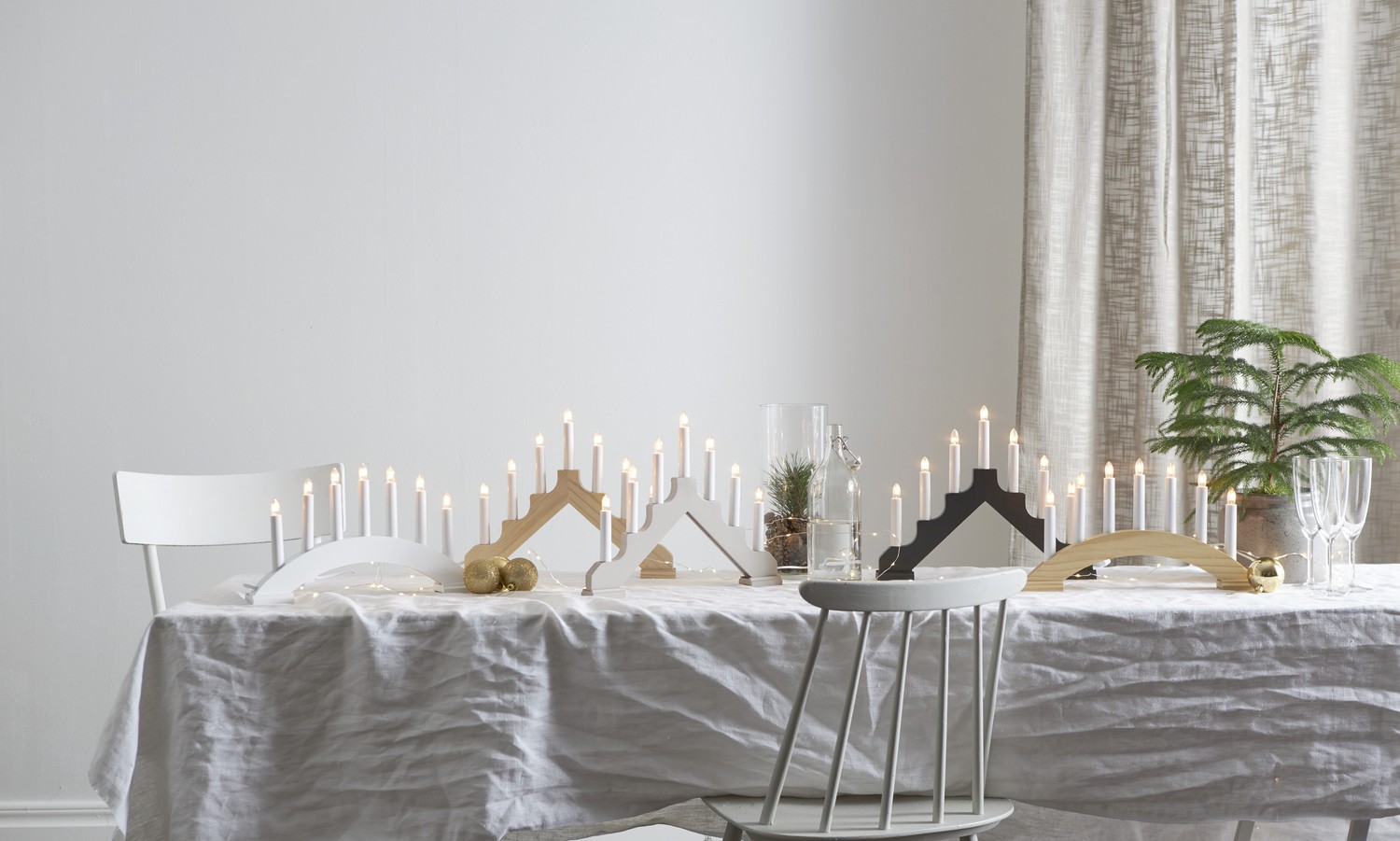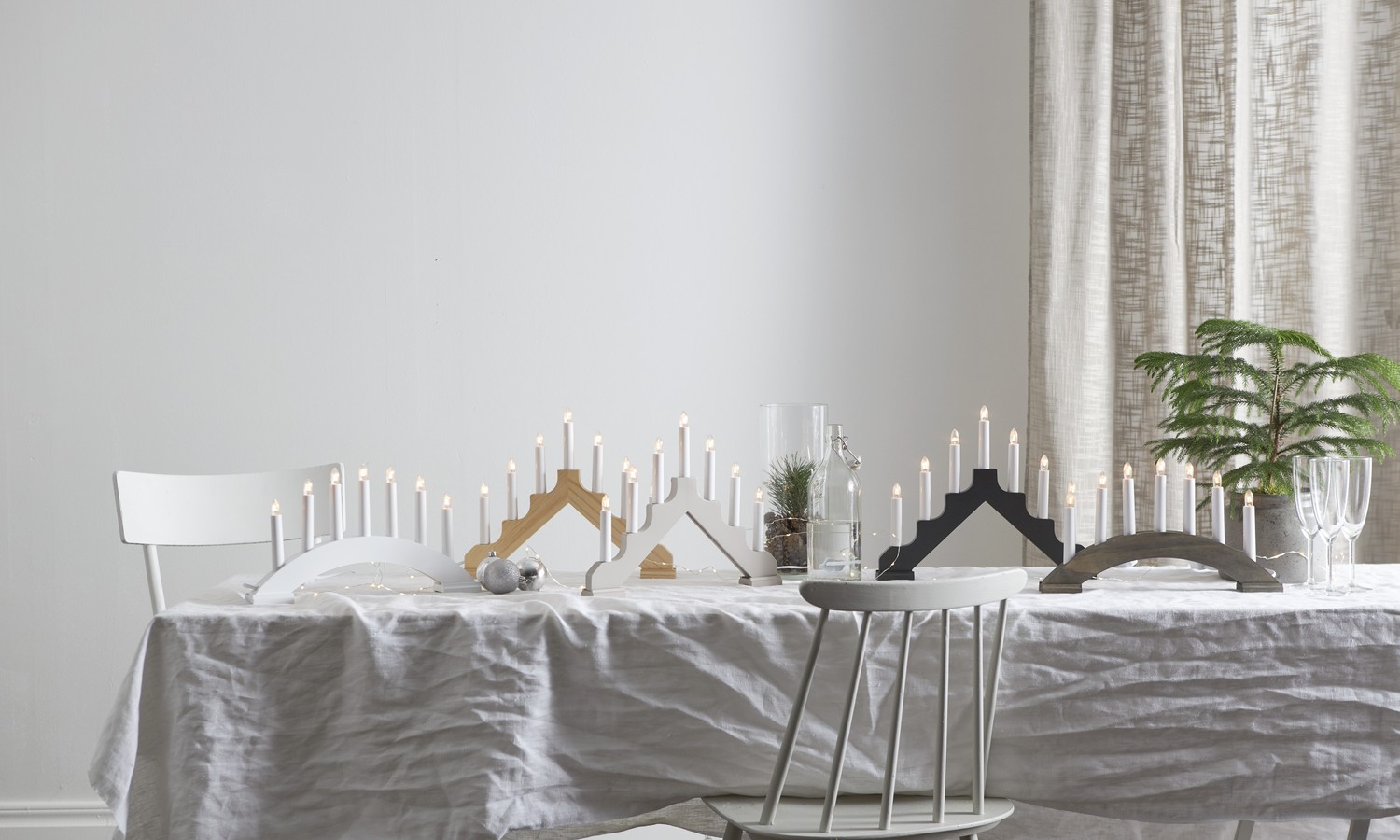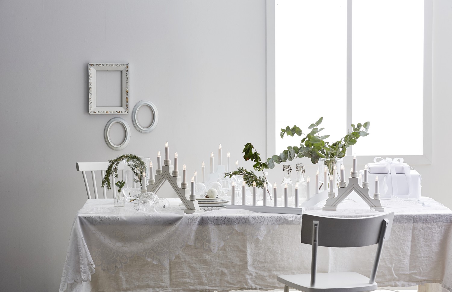 Vit träljusstake i bågform med 7 ljuskällor. En vacker ljusstake med härligt sken. Placera ljusstaken exempelvis i fönstret för att skapa en härlig adventstämning i hemmet.