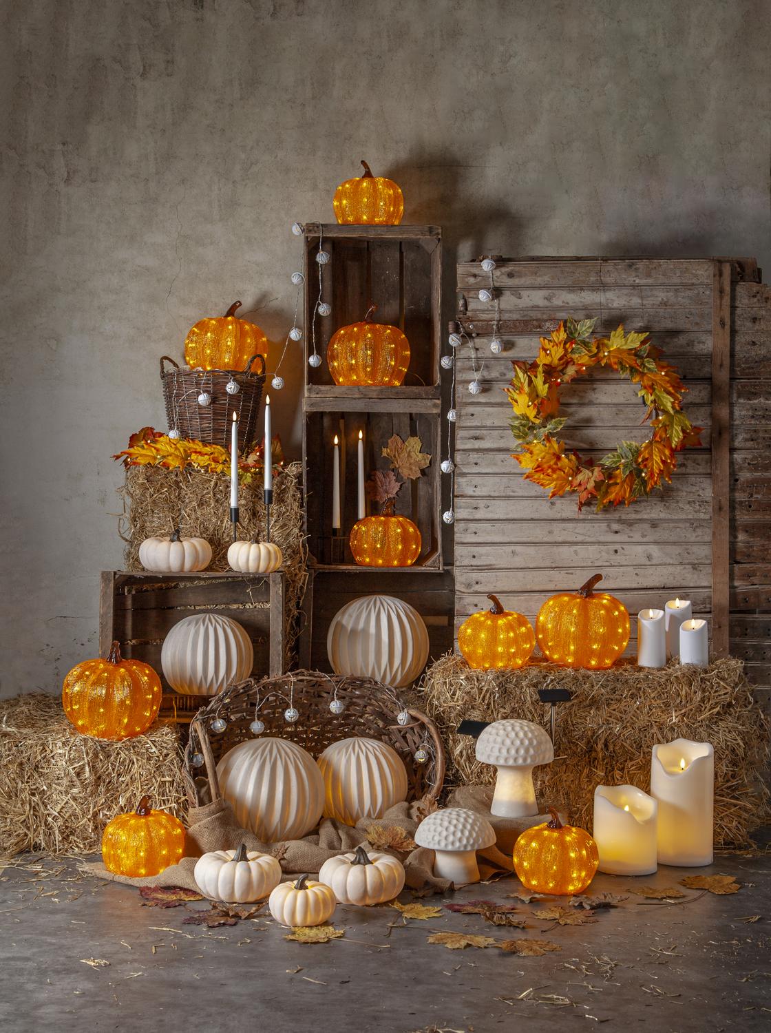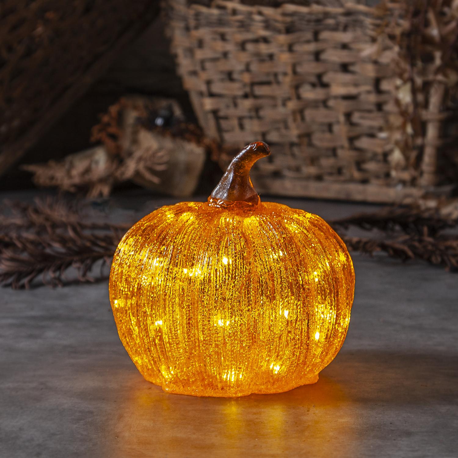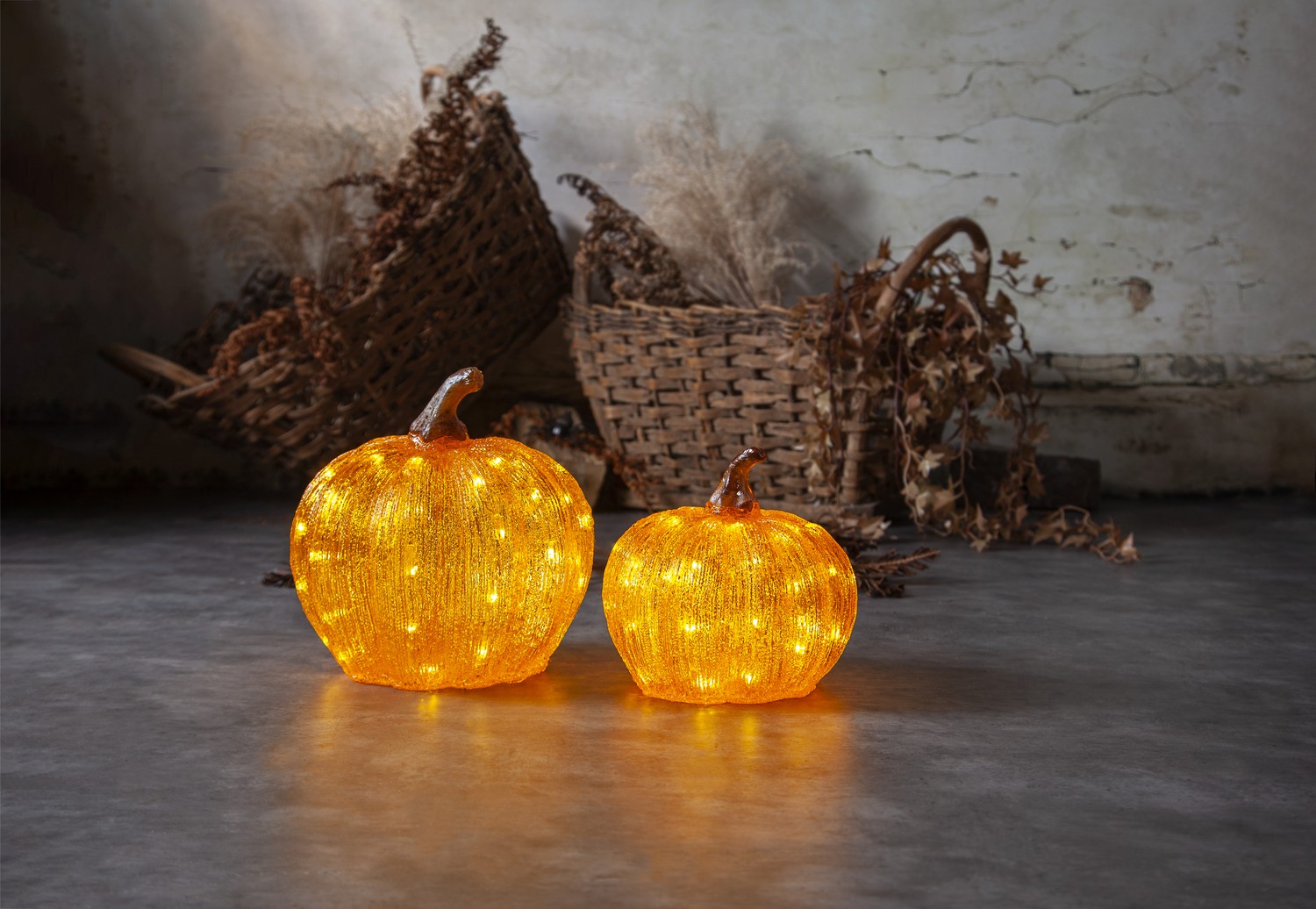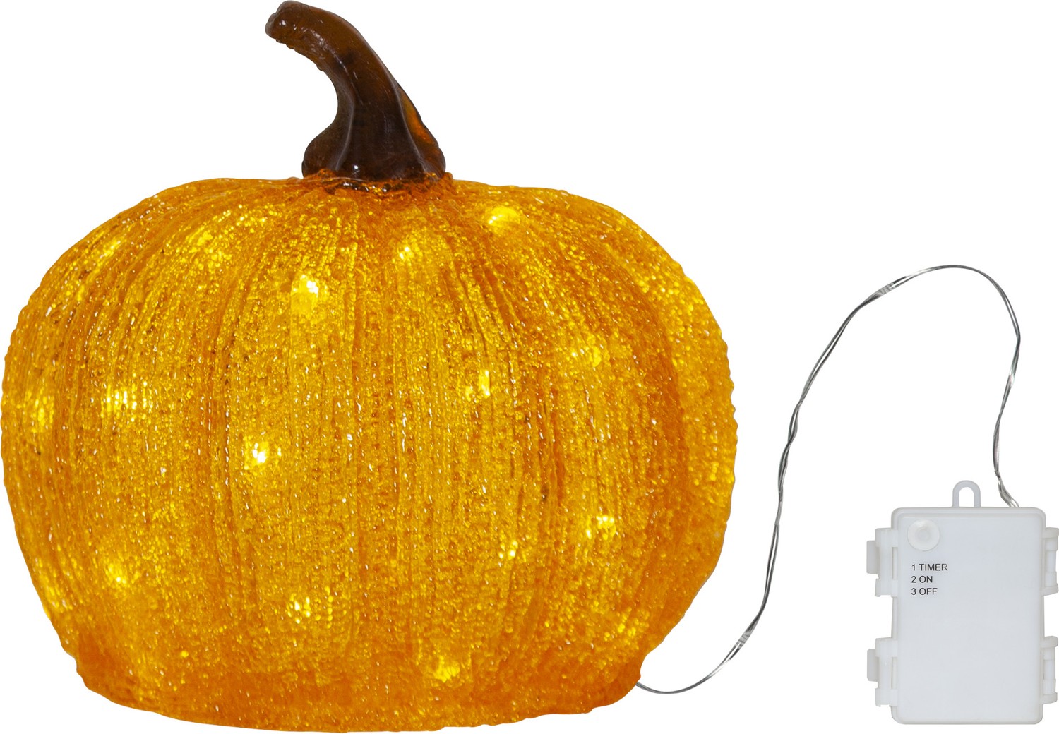 Acryldekorationen Harvy i form av en pumpa, 20 cm, passar lika bra inne som ute. Utmärkt till höstens dekorationer och Halloween, ger ett fint ljussken i tex trädgården, på altanen eller trappan. Harvy finns i två storlekar som med fördel kan kombineras ihop. Batterdriven med timerfunktion.