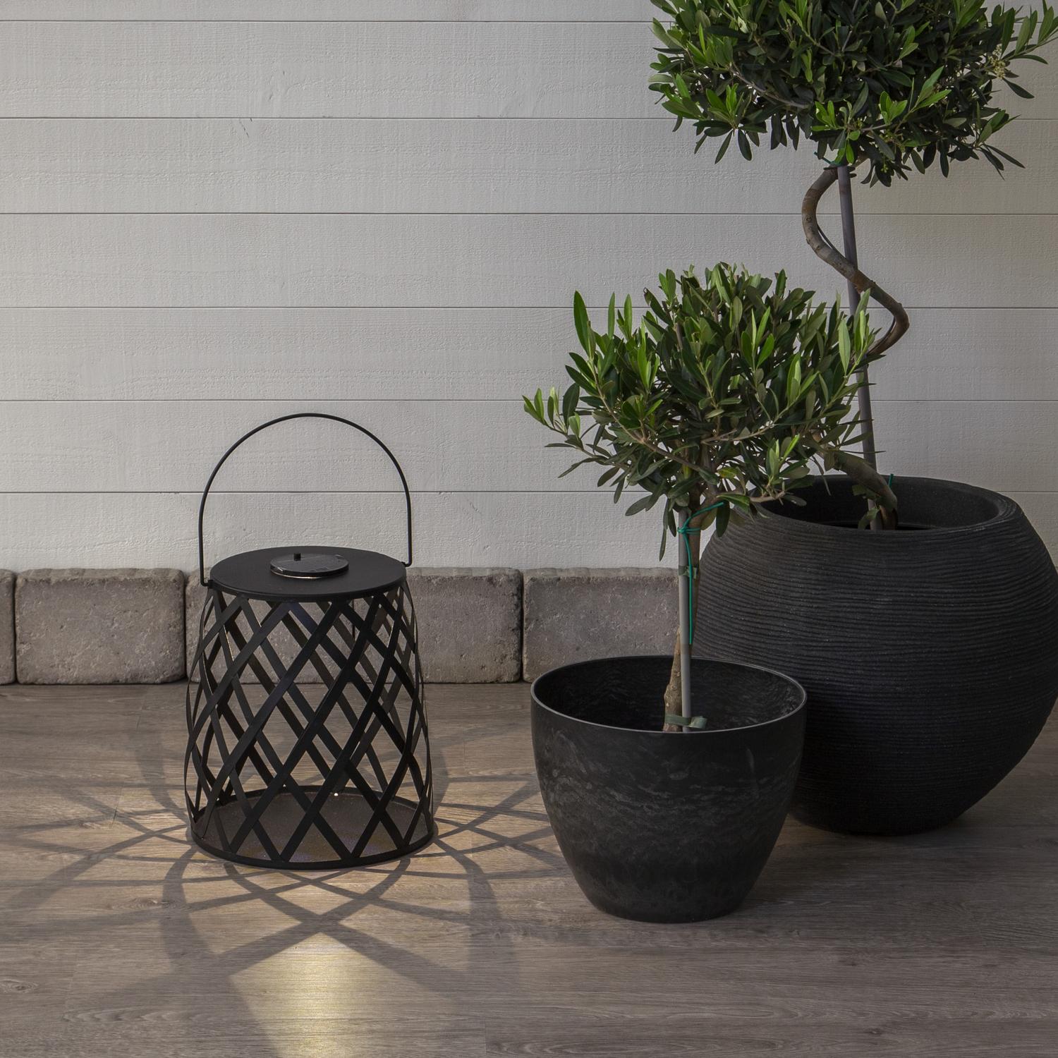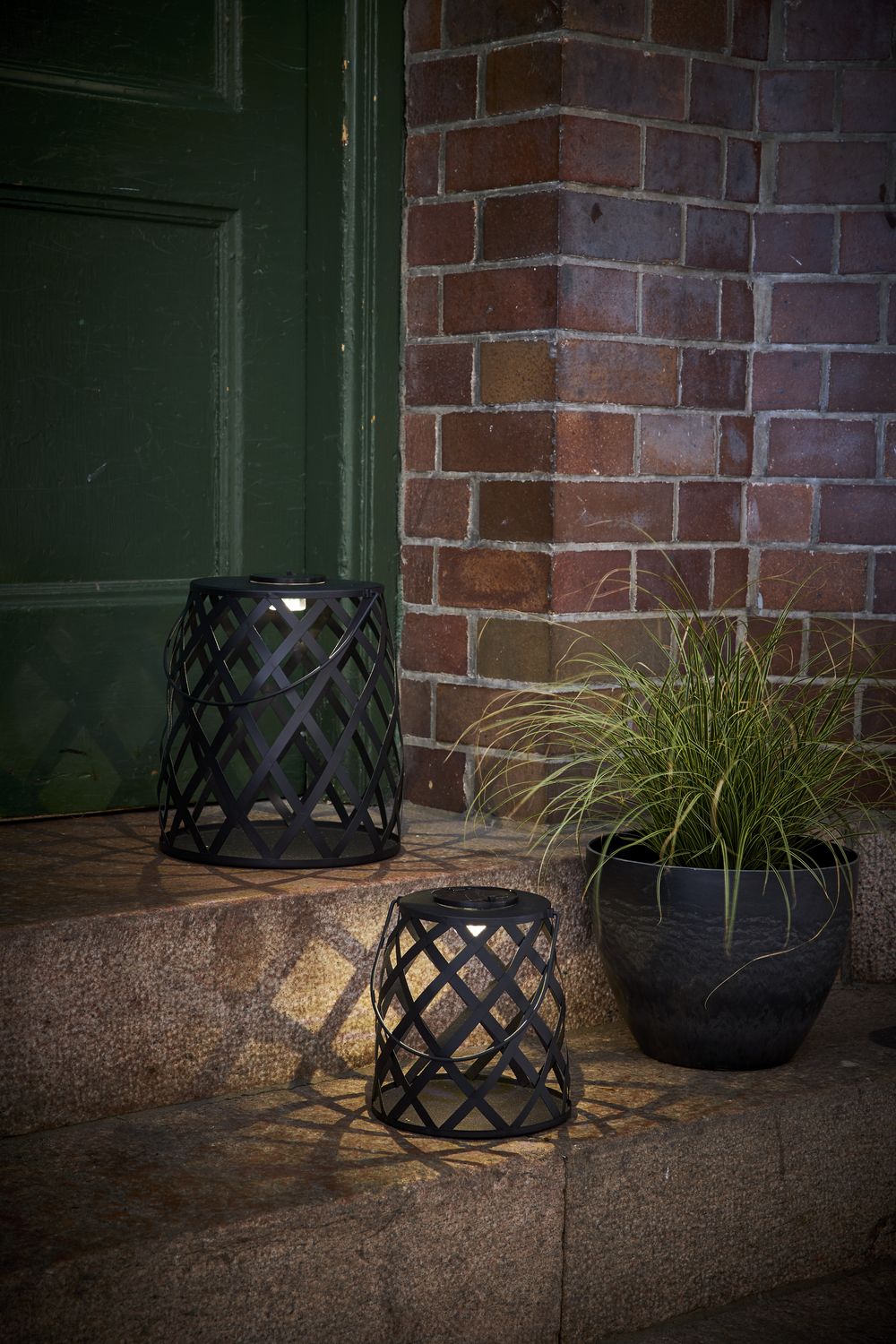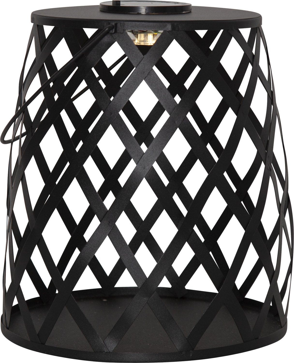 Lykta i metall med romb mönster som laddas upp av solen under dagen och lyser med 20 Lumen när det är mörkt.