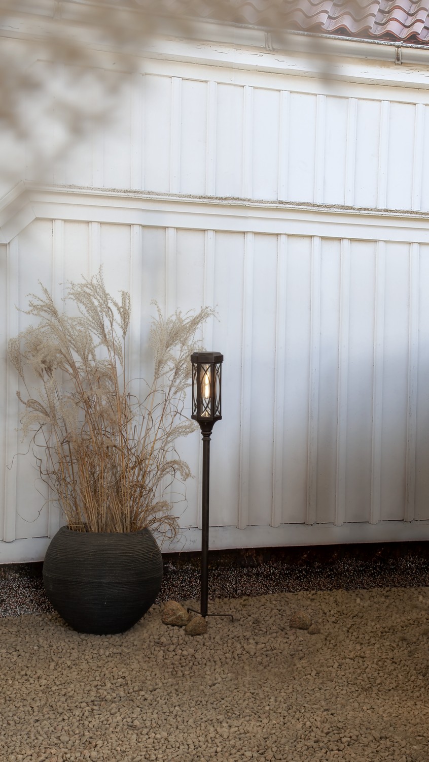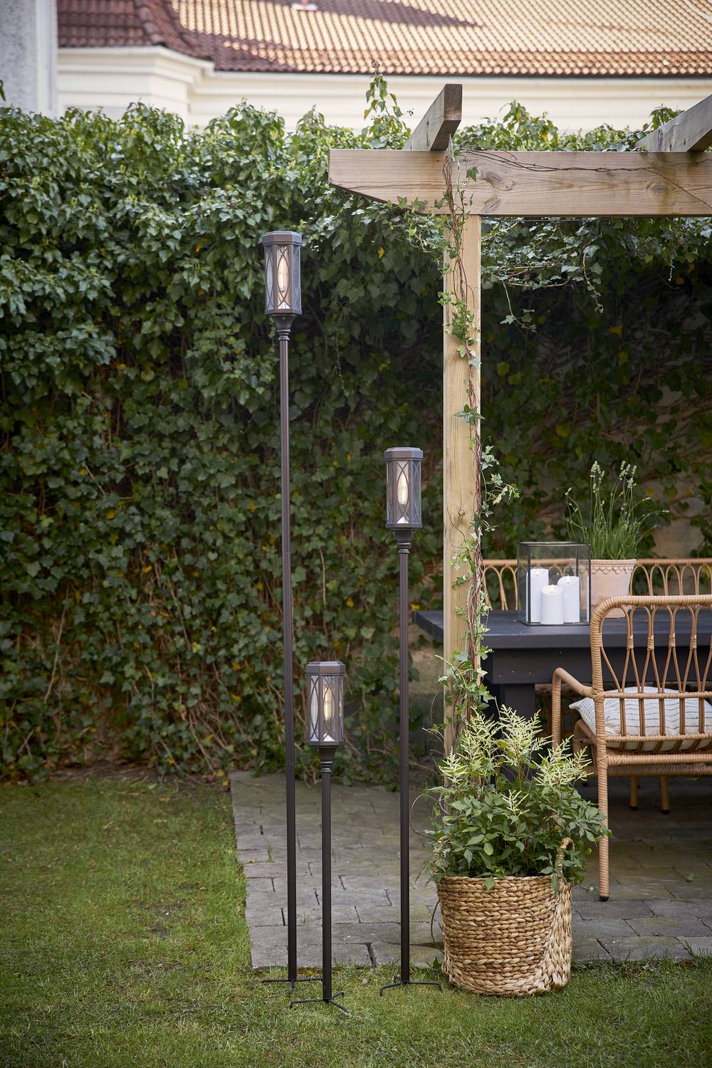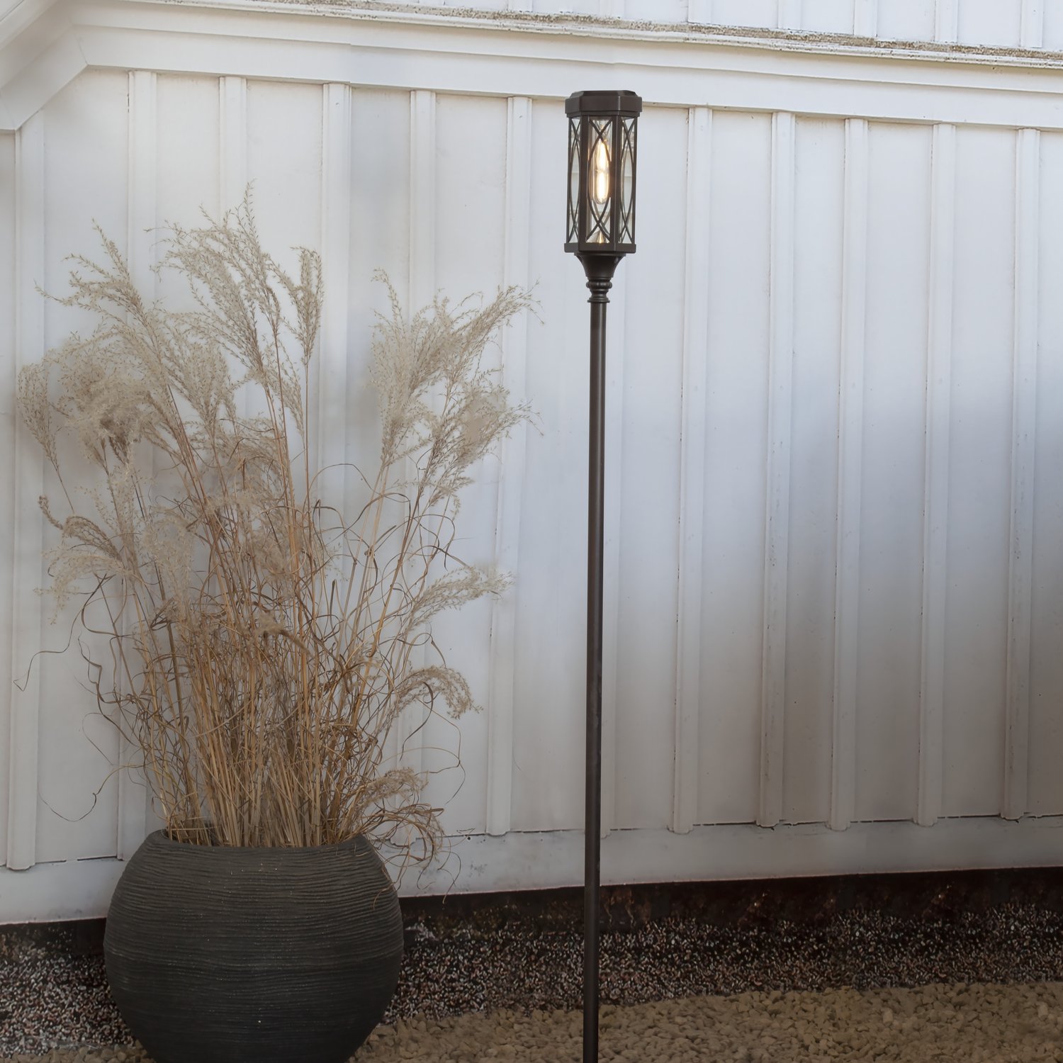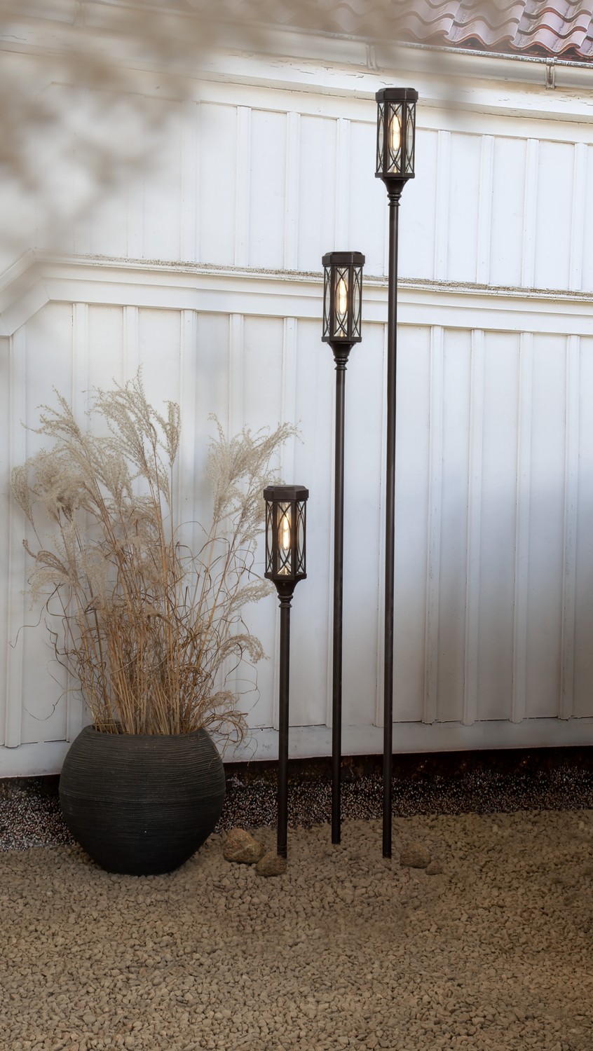 Solcellsdriven belysning som kan användas som gångbelysning eller fackla. Solcellspollaren är gjord i aluminium i en mörkbrun färg. Höjden går att justera i 3 höjder 79cm 130cm and 180cm. Filament LED som lyser upp med 10 Lumen under natten.